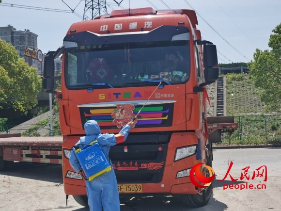疫情防控人員對(duì)外來(lái)貨車進(jìn)行消殺。人民網(wǎng)記者 王繼亮攝