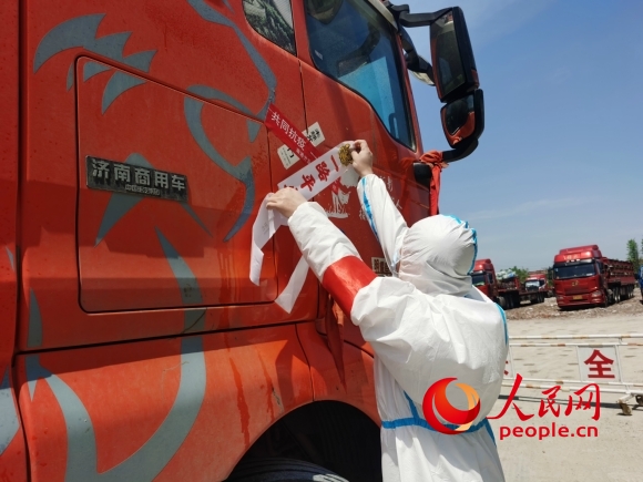 工作人員為外來(lái)貨車貼上封條。人民網(wǎng)記者 王繼亮攝