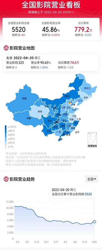 據(jù)國(guó)內(nèi)某專業(yè)電影數(shù)據(jù)平臺(tái),4月20日全國(guó)影院營(yíng)業(yè)率45.86%,營(yíng)業(yè)影院5520家,較上日增加60家,大盤票房779.2萬元。截至4月20日23時(shí),浙江省單日票房(4月20日)約為64萬元,總出票17678張,總場(chǎng)次13722場(chǎng),平均票價(jià)36元。