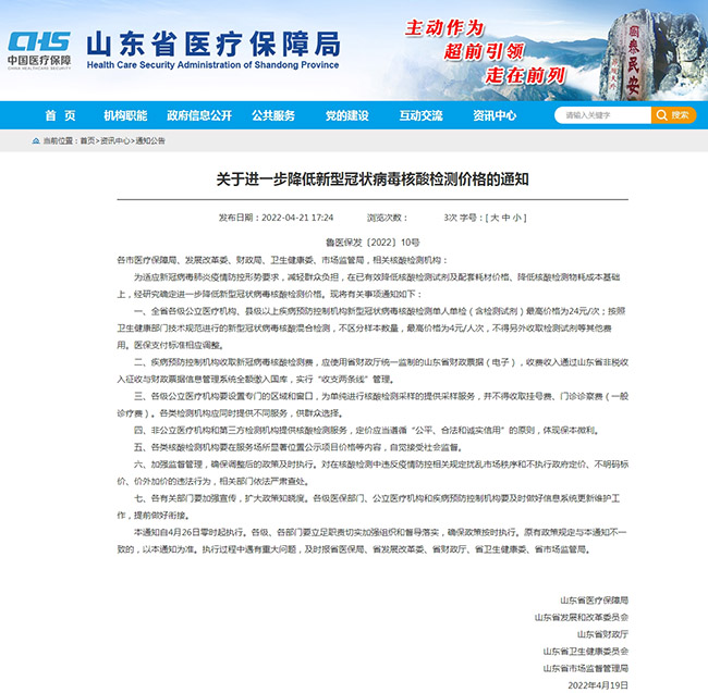 人民網(wǎng)濟(jì)南4月22日電(聶俊穹)21日,山東省醫(yī)保局、省發(fā)改委、省財(cái)政廳、省衛(wèi)生健康委、省市場(chǎng)監(jiān)管局等五部門(mén)聯(lián)合印發(fā)文件,自2022年4月26日零時(shí)起,進(jìn)一步降低新型冠狀病毒核酸檢測(cè)價(jià)格。