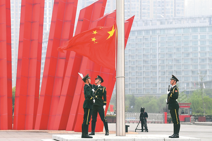 鮮艷的五星紅旗緩緩升起,迎著江風(fēng)高高飄揚。 本報記者 萬程鵬 攝