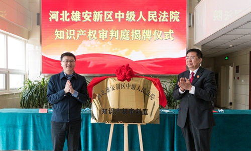 河北雄安新區(qū)中級人民法院知識產(chǎn)權(quán)審判庭揭牌儀式現(xiàn)場。 雄安中院供圖