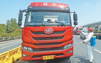 21日11時左右,記者在南京市雍莊交通樞紐見到郭輝時,他已做完核酸檢測和抗原檢測。防疫人員正拎著酒精壺對貨車實施全面消毒作業(yè)。丁健將5份介紹信交給卡口工作人員,工作人員核對后退還了暫留的駕駛證、行駛證,將郭輝駕駛的貨車放行。
