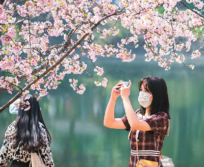 游客在江蘇省南京市中山植物園賞花拍照。蘇 陽(yáng)攝(新華社發(fā))