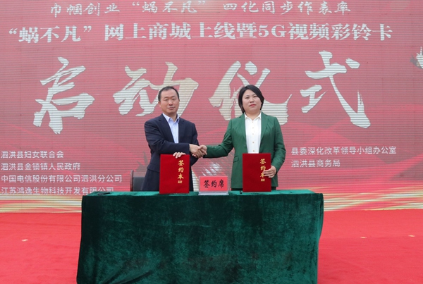 近日,江蘇省泗洪縣婦聯(lián)、改革辦、商務局、金鎖鎮(zhèn)人民政府和電信公司聯(lián)合舉辦“巾幗創(chuàng)業(yè)‘蝸不凡’,‘四化’同步作表率”現(xiàn)場活動,助力鄉(xiāng)村企業(yè)數(shù)字化復工復產。“蝸不凡”網上商城正式上線,5G視頻彩鈴卡同步啟動,電信公司和“蝸不凡”品牌企業(yè)簽訂了“云改數(shù)轉”合作協(xié)議。