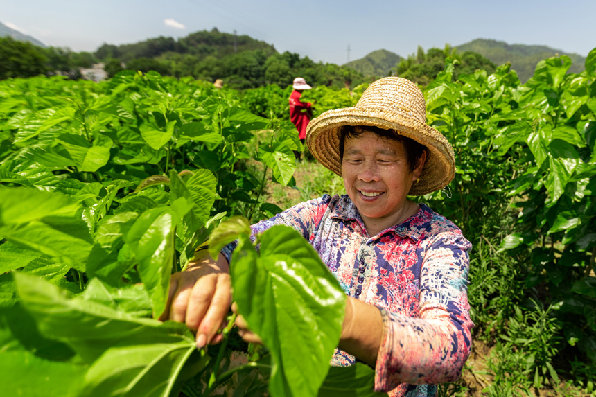在澧田鎮(zhèn)雙江村蠶?;兀Q農(nóng)在采摘桑葉。朱國(guó)朝攝