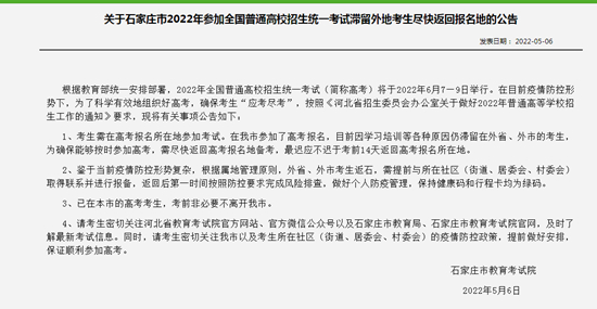 關(guān)于石家莊市2022年參加全國普通高校招生統(tǒng)一考試滯留外地考生盡快返回報名地的公告