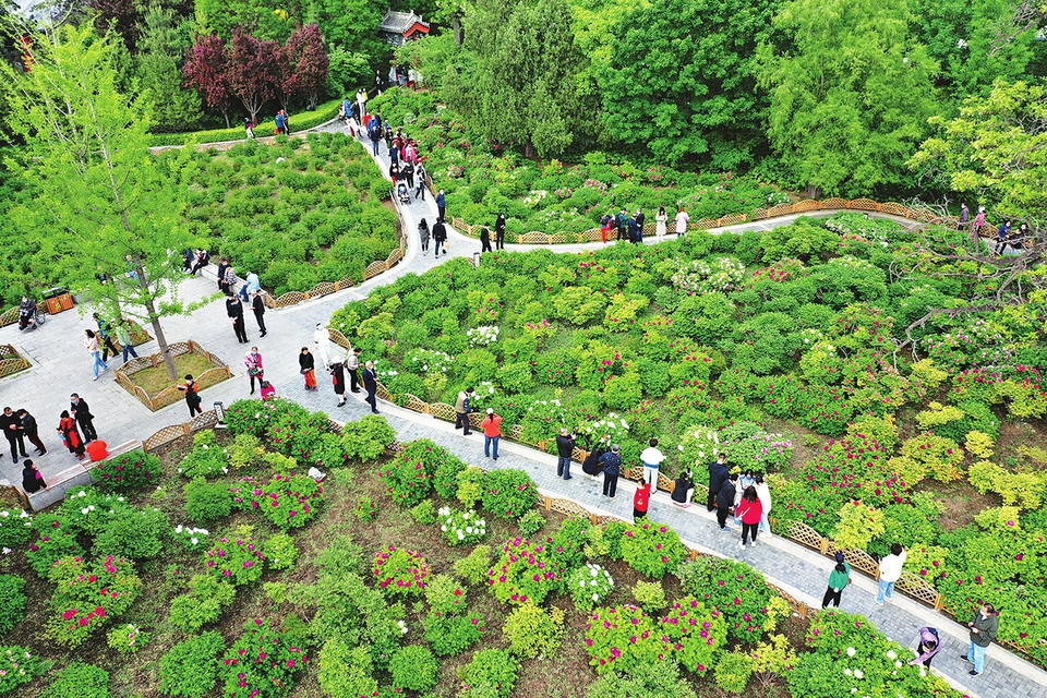 近日,太原迎澤公園牡丹園內(nèi),200多個(gè)品種、3000余株牡丹競相盛放,吸引了不少游客前來觀賞,呈現(xiàn)出人與自然和諧相融的綠色生態(tài)畫卷。圖為5月6日,從空中鳥瞰太原迎澤公園牡丹園。(記者李兆民攝)