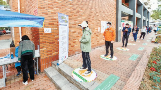 本報訊(記者 李瑤)昨天,東城區(qū)東四街道在轄區(qū)內5個常態(tài)化核酸檢測點推出新式“兩米線”,通過充滿童趣的“呼啦圈”地貼,引導居民有序排隊,保持安全距離。“呼啦圈”直徑大約80厘米,中間黃色腳印圖案十分醒目,旁邊還印有疫情防控科普貼,居民站在圈內有序排隊等待核酸檢測?!啊粌H富有童趣,使排隊等候不再那么乏味,還嚴格規(guī)定了排隊距離,保證大家的安全?!本用顸c贊說。本報記者 鄧偉攝