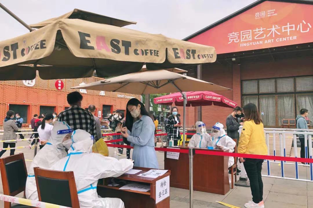 在通惠河畔文化創(chuàng)意產(chǎn)業(yè)園核酸檢測(cè)點(diǎn),一枚枚紅色“黨員志愿服務(wù)”袖標(biāo)格外醒目。