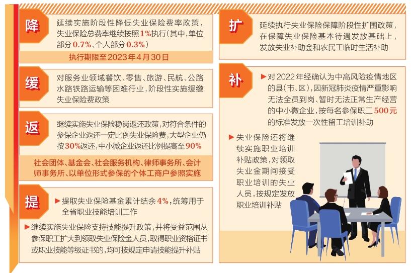 這次失業(yè)保險新政重點圍繞“降、緩、返、提、擴、補”等方面(詳細內(nèi)容見下圖)推出穩(wěn)崗位提技能防失業(yè)舉措。(記者高建華)