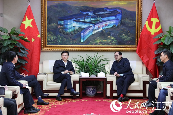 淮安市委書記陳之常(左)與人民日?qǐng)?bào)社江蘇分社社長(zhǎng)何聰座談。人民網(wǎng) 馬曉波攝