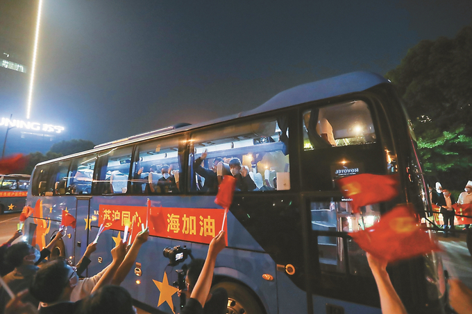 5月26日,江蘇援滬醫(yī)療隊(duì)方艙隊(duì)隊(duì)員在圓滿完成任務(wù)后返程,市民和醫(yī)護(hù)人員的親友們夾道歡迎凱旋的英雄們。 本報(bào)記者 陳儼 攝