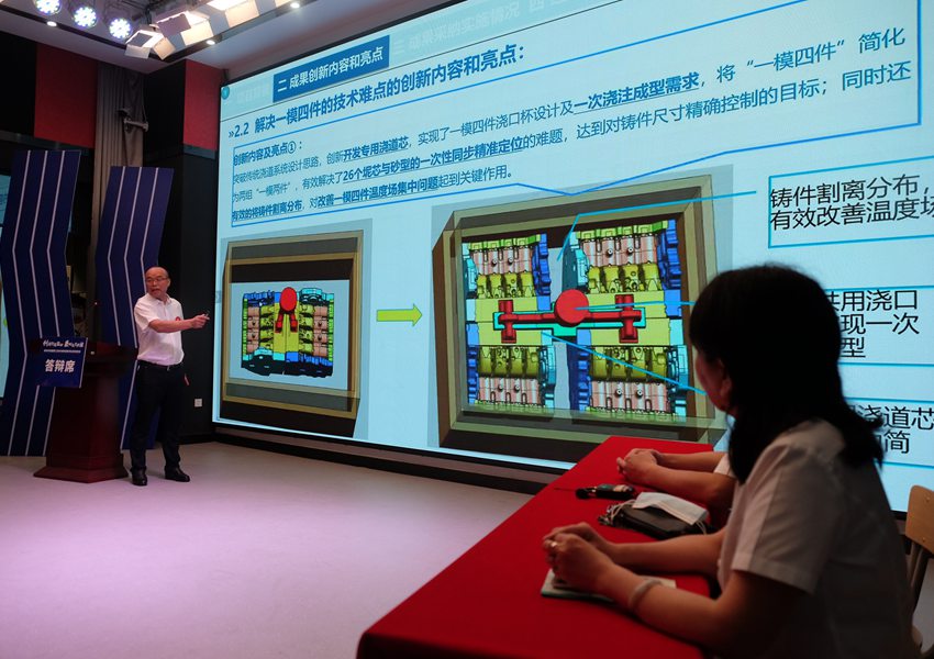 綠色生態(tài)座艙開發(fā)研究技術成果、變壓器套管換油裝置、高效率的一模四件發(fā)動機缸體毛坯關鍵技術研究及成果轉化應用、新能源退役動力電池在SGMW制造系統(tǒng)梯次利用項目、重卷機組關鍵設備減時操作法……參加決賽的項目成果完成人采用PPT講解和現場答辯相結合的形式進行對決。項目答辯人就項目立項背景、成果創(chuàng)新內容和亮點、成果采納實施情況、經濟效益、社會效益、獲獎情況等進行了介紹,并圍繞創(chuàng)新成果的創(chuàng)新性、原創(chuàng)性、成果應用成熟性、質量可靠性、成果的先進程度、成果技術水平和難易程度、成果提高勞動生產效率作用、經濟效益、社會效益、成果的適用范圍和推廣前景等方面回答評委的提問。