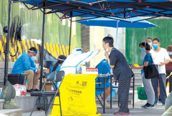北京28日迎來今年首個高溫日,為應(yīng)對高溫,北新橋地鐵站附近的核酸檢測點,設(shè)置遮陽篷、風(fēng)扇等設(shè)施,確保檢測順利進行。本報記者 潘之望攝