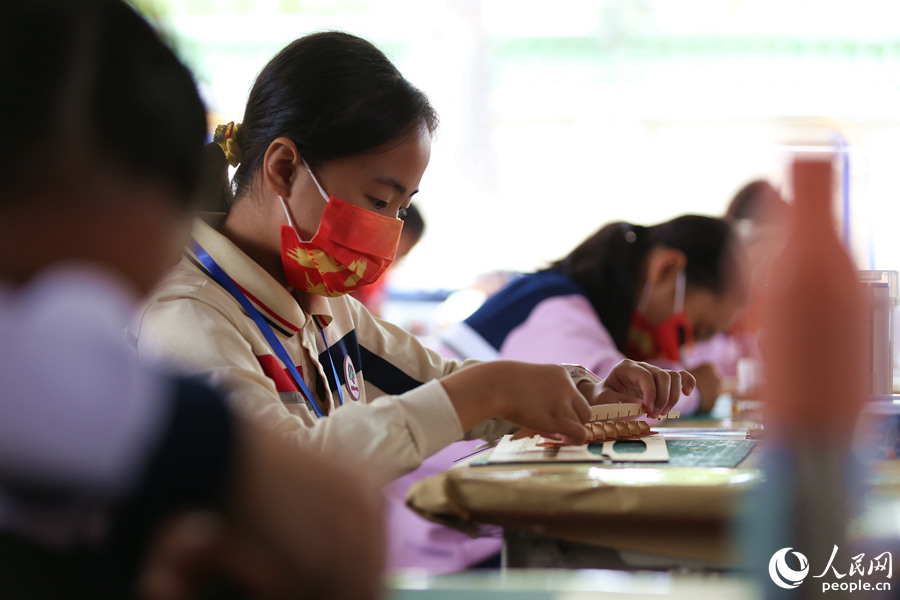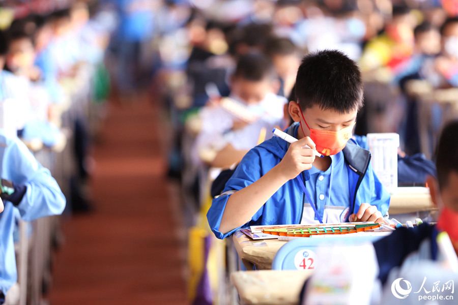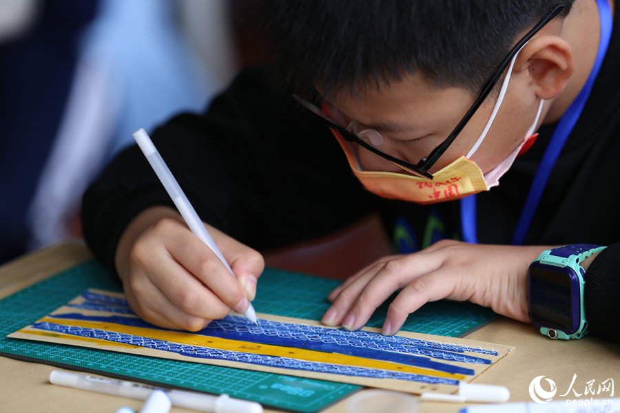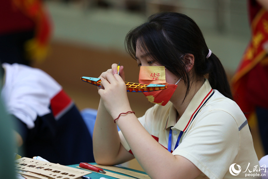 活動現場,選手們列隊進入各自賽場,用畫筆在龍舟模型素材板上畫出各式圖案,再將一個個零部件手工拼接,組裝成一條條獨具特色的“小龍舟”,船體或是金銀鱗甲,或是祥云波浪,色彩斑斕,風格不一。