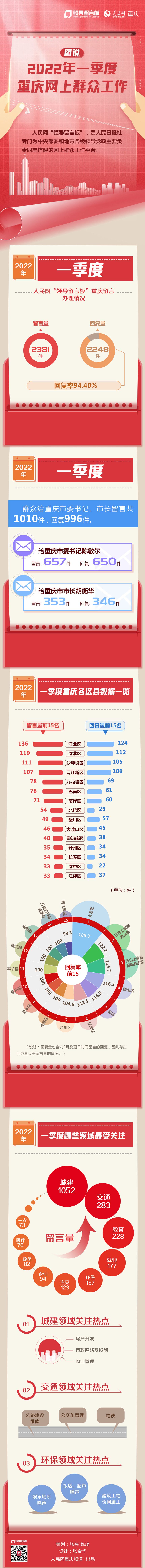 人民網(wǎng)重慶4月20日電 (陳琦)近日,人民網(wǎng)“領(lǐng)導(dǎo)留言板”2022年一季度重慶版塊留言辦理情況數(shù)據(jù)出爐。一季度,群眾通過“領(lǐng)導(dǎo)留言板”給重慶市各級領(lǐng)導(dǎo)干部的留言量2381件,其中有2248件留言得到回復(fù),留言回復(fù)率為94.4%。