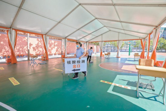 用紅色遮陽棚搭建在操場上的室外休息區(qū),下午考試結束后將變身核酸檢測區(qū)。 本報記者 潘之望攝