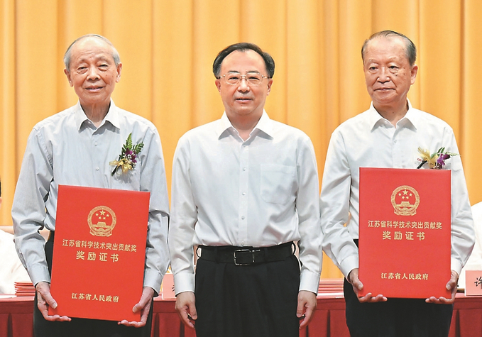 六月九日,省委、省政府舉行全省科學(xué)技術(shù)獎(jiǎng)勵(lì)大會(huì)。吳政隆為榮獲二〇二〇年度省科學(xué)技術(shù)突出貢獻(xiàn)獎(jiǎng)的中國(guó)工程院院士、中國(guó)電子科技集團(tuán)第十四研究所教授賁德(右)和中國(guó)科學(xué)院院士、南京大學(xué)教授鄭有炓頒獎(jiǎng)并合影。 本報(bào)記者 吳勝 朱江 攝