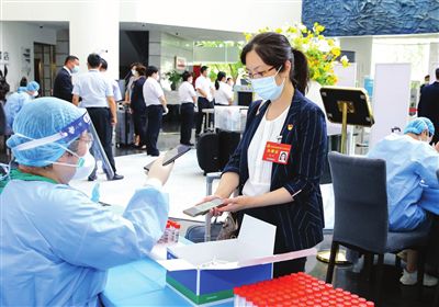 因新冠疫情防控需要,此次黨代會(huì)實(shí)行全程閉環(huán)管理。“請您先測一下體溫?!惫ぷ魅藛T熱情地引導(dǎo)著。代表們佩戴口罩,保持間距,有序完成測溫、驗(yàn)碼、安檢、流調(diào)、核酸檢測,隨后全身心投入到參會(huì)各項(xiàng)準(zhǔn)備工作。