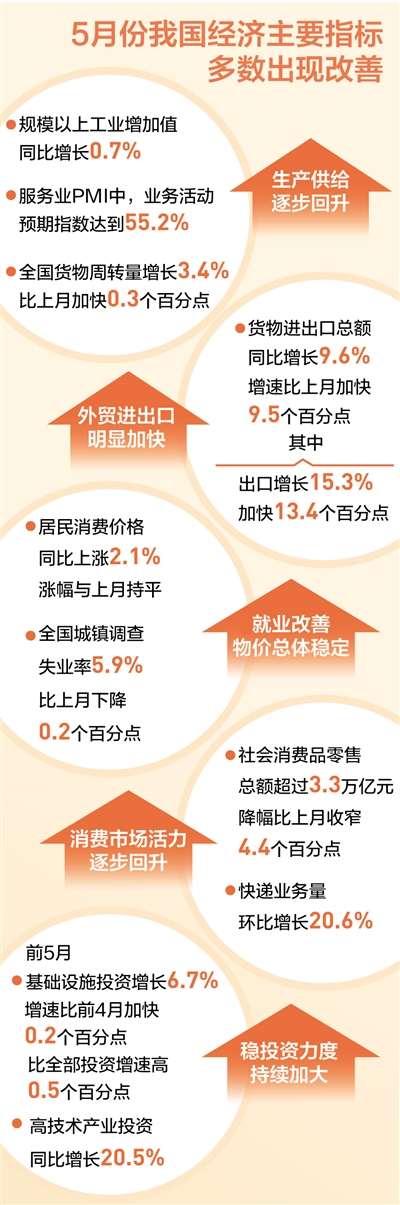 5月,我國經(jīng)濟(jì)運(yùn)行出現(xiàn)積極變化,主要指標(biāo)多數(shù)出現(xiàn)改善。