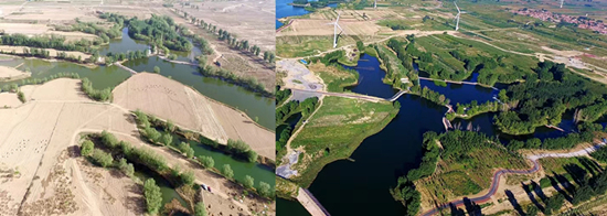 懷來(lái)官?gòu)d水庫(kù)周邊2017年和2021年防沙治沙對(duì)比圖。 河北省林業(yè)和草原局供圖