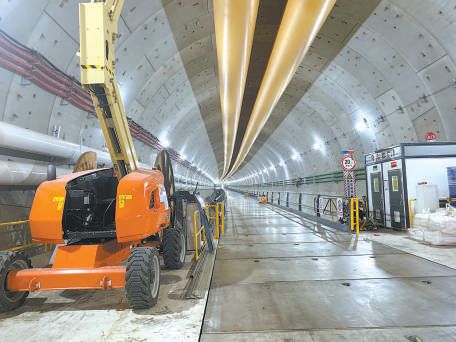 走進項目工地,沒有想象中的機械轟鳴聲,施工現(xiàn)場位于幾十米深的地下。記者從地面乘坐直梯,順著盾構(gòu)機始發(fā)井,來到地下26米處的西線隧道內(nèi)。國產(chǎn)最大直徑泥水平衡盾構(gòu)機“京華號”,已在西線隧道里向前掘進了近4000米。眼前的西線隧道,蜿蜒著向南延伸。開工初期,記者從始發(fā)井步行幾分鐘即可抵達盾構(gòu)機駕駛艙位置;這次采訪,施工方特意安排了1輛純電動代步車。“現(xiàn)在盾構(gòu)機離始發(fā)井有些遠,工作人員上下班都得坐車?!瘪{駛員說,這輛電動代步車是用吊車吊到隧道內(nèi)的,還特意為它在隧道里安了充電樁,“這輛車再回到地面,就得是隧道貫通的時候啦!”