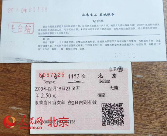 鐵路迷收藏的老豐臺(tái)站車票及站臺(tái)票。 人民網(wǎng) 李博攝