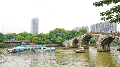 兩艘船2022年3月底進廠,改造前后經(jīng)歷兩個多月,杭州水上發(fā)展集團有限公司相關(guān)負責人說:“為了更好地發(fā)揮運河游船的文化特色優(yōu)勢,我們緊扣‘中國新時代、杭州新亞運’的目標定位,精心改造升級了兩艘水上巴士。”水上巴士還是亞運特許零售點,游客在船上可購買到心儀的亞運紀念品,船舶運營過程中還會途經(jīng)亞運會吉祥物“宸宸”的原型——拱宸橋,兩岸的市民游客還可與亞運特色船、拱宸橋來個合影。