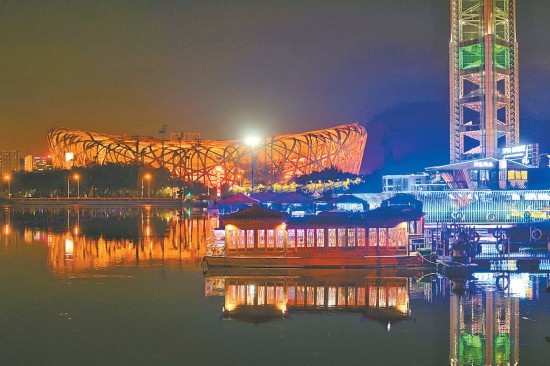 鳥巢北側(cè)的月色碼頭霓虹閃爍,濱水而建的月色碼頭已成為一處公園式消夏廣場。本報記者 潘之望攝