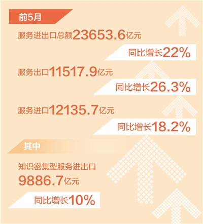 知識密集型服務(wù)貿(mào)易穩(wěn)定增長。前5月,知識密集型服務(wù)進(jìn)出口9886.7億元,同比增長10%。其中,知識密集型服務(wù)出口5602.4億元,增長13.6%;出口增長較快的領(lǐng)域是電信計(jì)算機(jī)和信息服務(wù)、其他商業(yè)服務(wù),分別增長18.5%、13.2%。知識密集型服務(wù)進(jìn)口4284.3億元,增長5.6%;進(jìn)口增長較快的領(lǐng)域是保險(xiǎn)服務(wù),增速達(dá)74.2%。