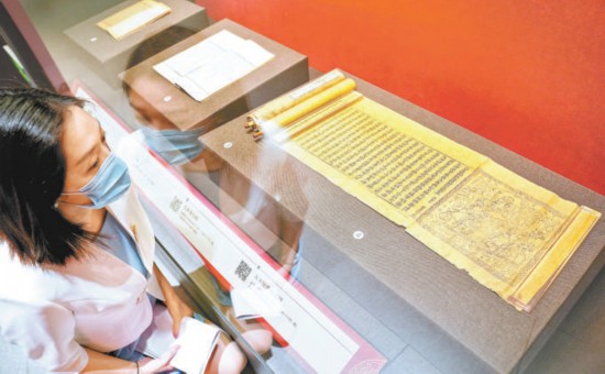 昨天,在“冊(cè)府?dāng)X珍——民族文化宮典藏古籍精品展”現(xiàn)場(chǎng),觀眾仔細(xì)欣賞展品。本報(bào)記者 方非攝