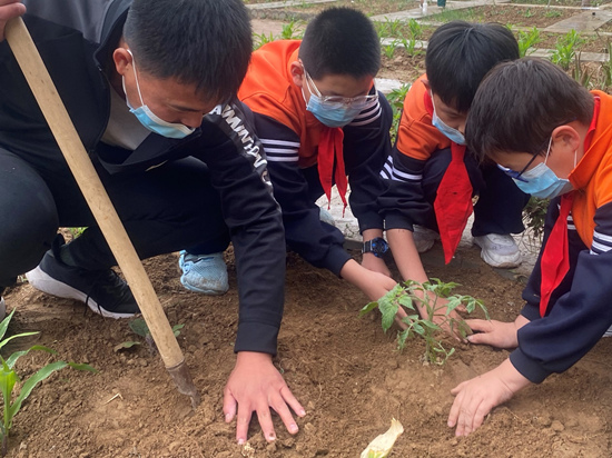 河北省威縣第五中學(xué)教育集團(tuán)師生在勞動(dòng)教育實(shí)踐基地移栽西紅柿植株。 趙國華攝