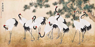 《松齡鶴壽圖》是陳之佛工筆花鳥中尺幅較大的一幅,是為慶祝中華人民共和國成立十周年的獻禮作。10只體態(tài)優(yōu)雅的丹頂鶴,安逸地徜徉于大地之上,或昂首唳天,或回首顧盼,或凝神遠眺,蒼翠的古松由畫面右上方伸入,枝干蒼勁古樸,松枝郁郁蔥蔥,蘊含著無限生機。陳之佛在中國畫傳統(tǒng)線描基礎上,將西洋畫和裝飾畫的線條加以改造后融入其中,使線條的表現(xiàn)力更為豐富。