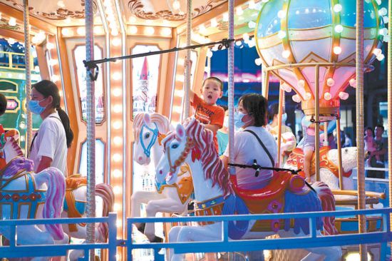 昨晚,北京經(jīng)開區(qū)大族廣場(chǎng)室外區(qū)域熱鬧非常,市民趁著夜色來這里吃飯、購物、游玩,廣場(chǎng)上的游樂設(shè)施前人頭攢動(dòng),孩子們?cè)诩议L陪同下快樂玩耍。本報(bào)記者 和冠欣攝