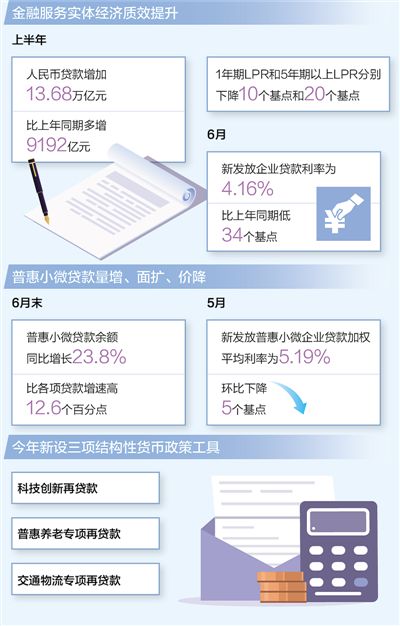數(shù)據(jù)顯示,上半年,我國社會融資規(guī)模增量為21萬億元,同比多增3.2萬億元,人民幣貸款增加13.68萬億元,比上年同期多增9192億元。與此同時,央行持續(xù)釋放貸款市場報價利率(LPR)改革潛力,1年期LPR和5年期以上LPR分別下降10個基點(diǎn)和20個基點(diǎn),6月份新發(fā)放企業(yè)貸款利率為4.16%,比上年同期低34個基點(diǎn),企業(yè)綜合融資成本穩(wěn)中有降,金融服務(wù)實(shí)體經(jīng)濟(jì)的質(zhì)量和效率明顯提升。