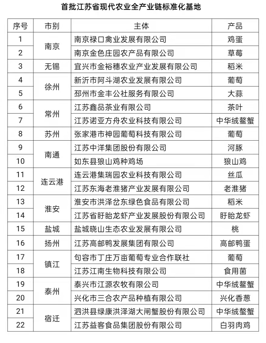 江蘇公布首批22家現(xiàn)代農(nóng)業(yè)全產(chǎn)業(yè)鏈標(biāo)準(zhǔn)化基地