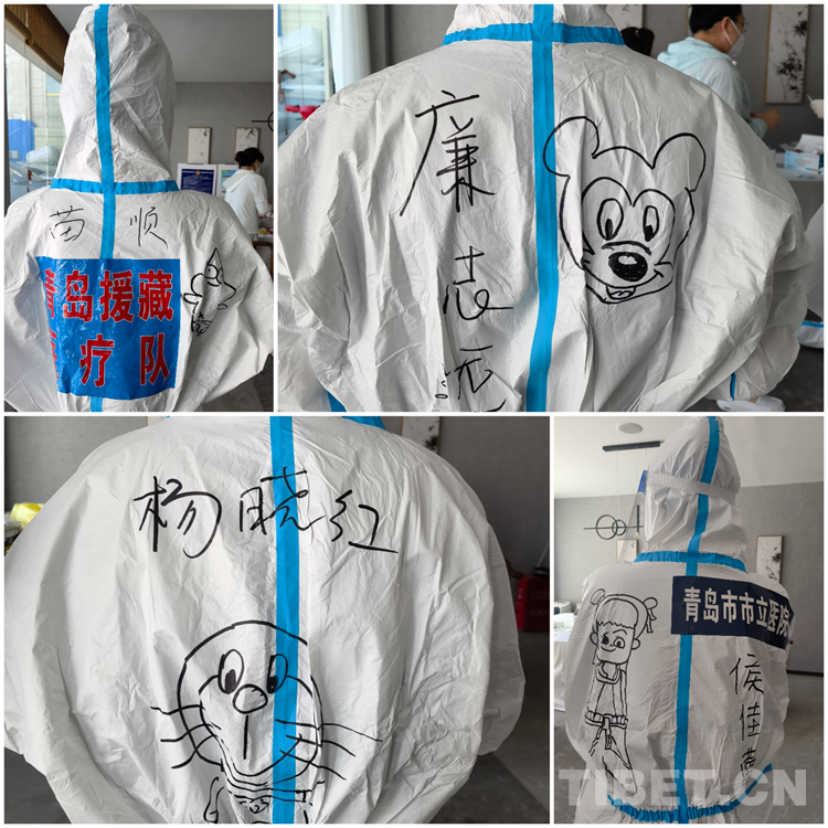 圖為青島“大白”們身著漫畫“戰(zhàn)袍”在日喀則戰(zhàn)“疫”一線合影留念