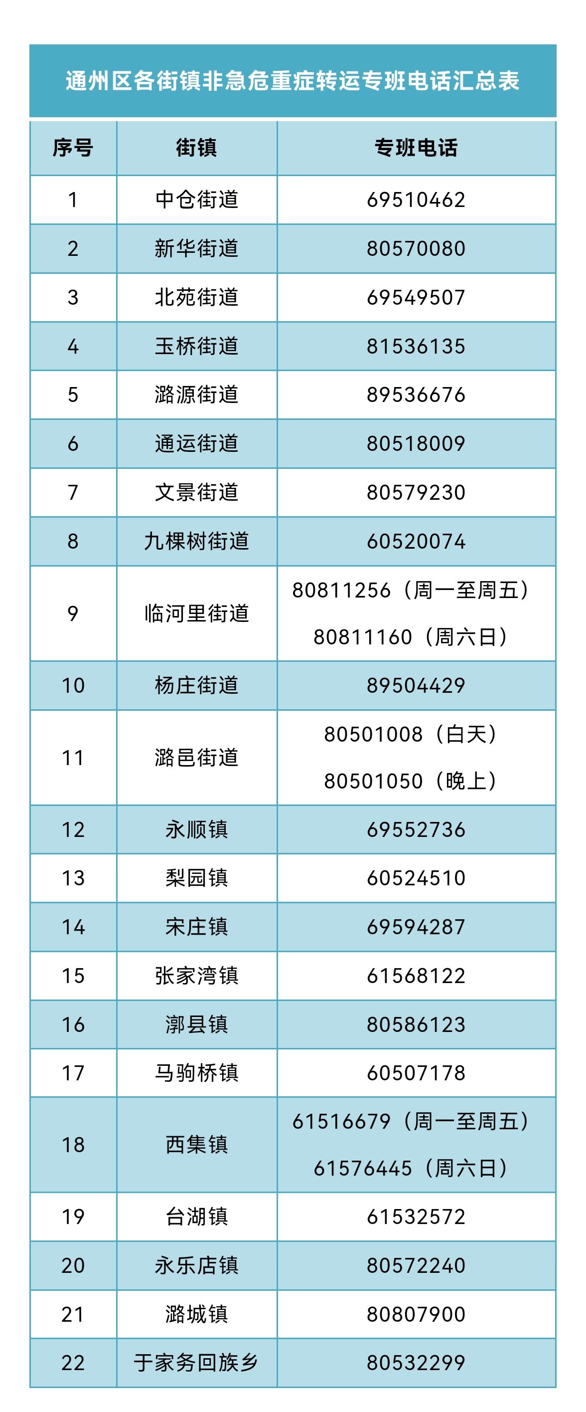 人民網(wǎng)北京12月21日電 為進(jìn)一步保障非急危重癥群眾就醫(yī)需求,不擠占120醫(yī)療急救資源,暢通就醫(yī)出行通道,將120救護車留給急危重癥患者,北京市通州區(qū)向社會公布各街道鄉(xiāng)鎮(zhèn)非急危重癥轉(zhuǎn)運專班熱線電話(具體熱線電話見下表)。