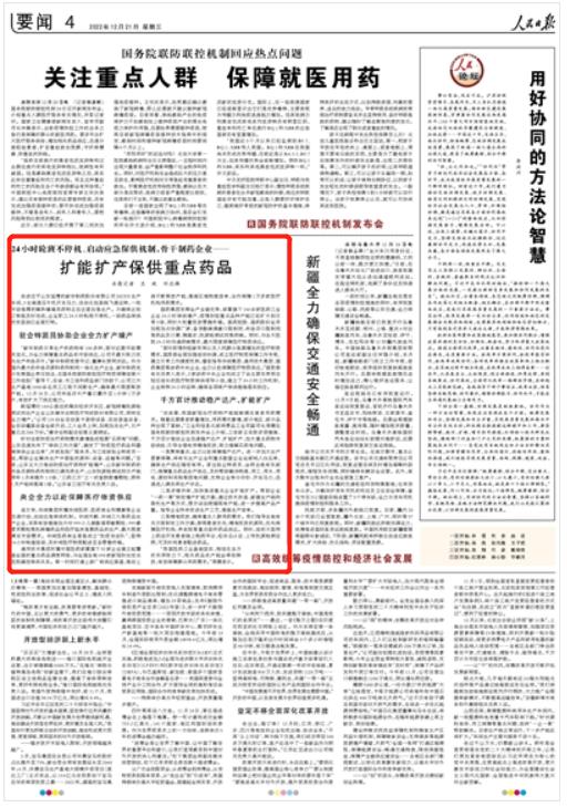 針對(duì)當(dāng)前防疫治療藥物需求激增造成短期“買(mǎi)藥難”問(wèn)題,山東迅速發(fā)布了“保供工作方案”,確定了“防疫醫(yī)療藥品和器械保供企業(yè)名單”,并派駐駐廠服務(wù)員,與工信部駐企特派員一起,幫助企業(yè)解決生產(chǎn)中面臨的原料、設(shè)備、運(yùn)輸?shù)葐?wèn)題?!澳壳?,山東正大力推動(dòng)防疫治療藥物擴(kuò)能增產(chǎn),山東新華制藥的布洛芬原料藥和制劑已滿負(fù)荷生產(chǎn),山東抗原檢測(cè)試劑日產(chǎn)能明年1月將提升1.5倍,‘三藥三方’之一的宣肺敗毒顆粒,明年1月產(chǎn)能將提高1倍?!鄙綎|省工信廳有關(guān)負(fù)責(zé)人說(shuō)。