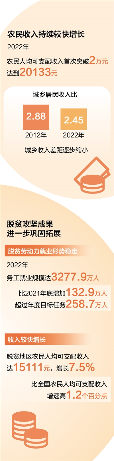 增加農(nóng)民收入是“三農(nóng)”工作的中心任務。2022年,農(nóng)民人均可支配收入首次突破2萬元,城鄉(xiāng)居民收入比從2012年的2.88下降到2022年的2.45,城鄉(xiāng)收入差距逐步縮小?!耙惨吹?,當前農(nóng)民收入增速有所放緩,增收動能有所減弱。必須高度重視,拿出長短結(jié)合、務實管用的硬措施,拓寬農(nóng)民增收致富渠道?!敝醒朕r(nóng)辦專職副主任、農(nóng)業(yè)農(nóng)村部黨組成員吳宏耀說。對此,今年中央一號文件在穩(wěn)定就業(yè)、經(jīng)營增效、挖潛財產(chǎn)收入以及拓展轉(zhuǎn)移收入等方面作出相關(guān)部署,努力讓農(nóng)民腰包越來越鼓,日子越過越紅火。