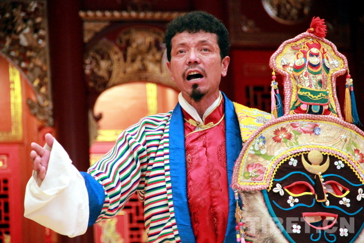 圖為拉薩市城關(guān)區(qū)娘熱民間藝術(shù)團(tuán)演員洛桑卓瑪表演藏戲開場(chǎng)《溫巴頓》片段 攝影:劉莉