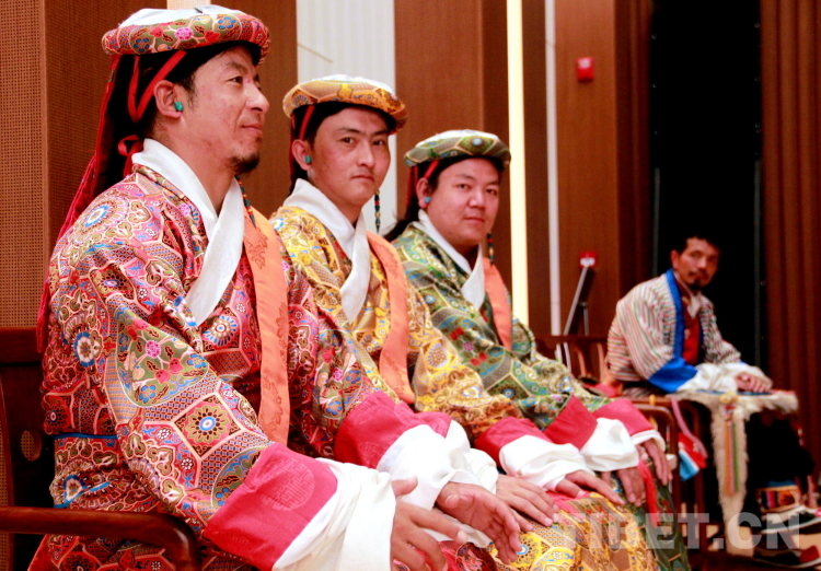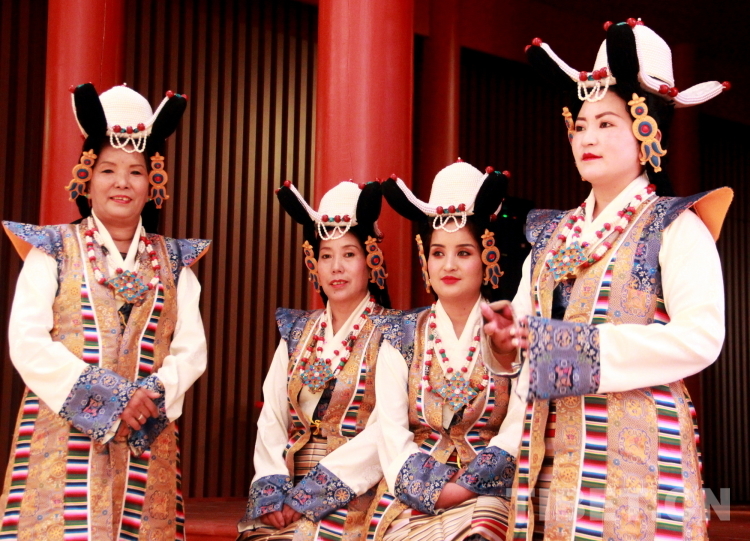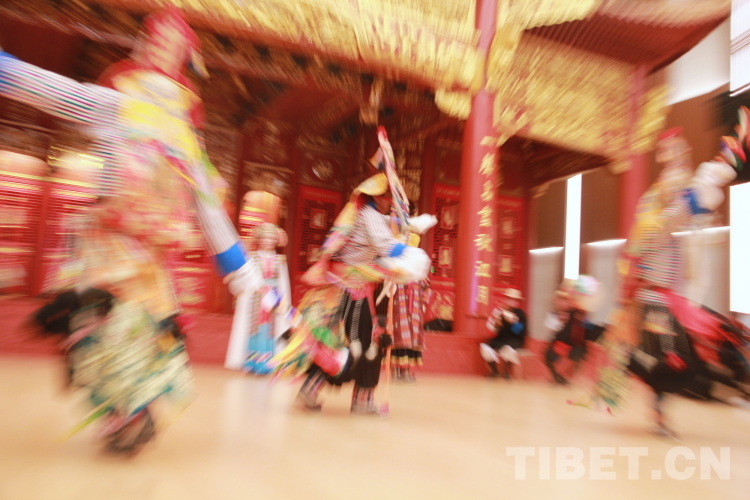 圖為拉薩市城關(guān)區(qū)娘熱民間藝術(shù)團(tuán)演員表演國(guó)家級(jí)非物質(zhì)文化遺產(chǎn)“嘎爾”攝影:劉莉