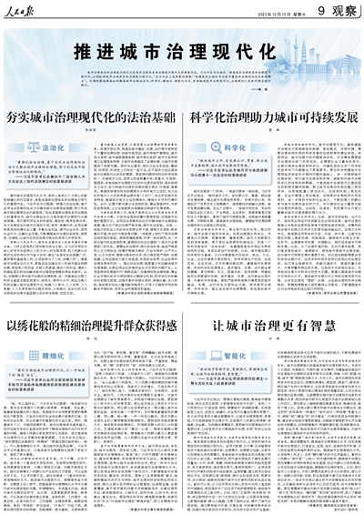 城市治理體系和治理能力現(xiàn)代化是國家治理體系和治理能力現(xiàn)代化的重要內(nèi)容。習(xí)近平總書記指出:“推進國家治理體系和治理能力現(xiàn)代化,必須抓好城市治理體系和治理能力現(xiàn)代化?!笨倳浽谏虾?疾鞎r強調(diào):“把增進民生福祉作為城市建設(shè)和治理的出發(fā)點和落腳點”。本期觀察版圍繞如何提高城市治理法治化、科學(xué)化、精細化、智能化水平,更好推進城市治理現(xiàn)代化、全面踐行人民城市理念進行探討。