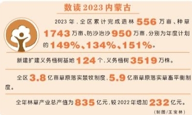 此外,2023年內(nèi)蒙古林草改革不斷深化,產(chǎn)業(yè)發(fā)展提質(zhì)提效,林草碳匯扎實推進(jìn),支撐保障顯著提升。全年林草產(chǎn)業(yè)總產(chǎn)值為835億元,較2022年增加232億元。全區(qū)新建草種繁育基地17.15萬畝、全年制種能力有望突破500萬公斤,預(yù)計全年飼草產(chǎn)量將達(dá)到8000萬噸以上。(記者 霍曉慶)