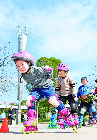 浙江省臺(tái)州市仙居縣一公園,小朋友在學(xué)習(xí)輪滑。王華斌攝/光明圖片