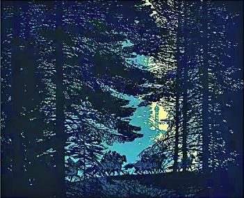 面對(duì)彼時(shí)套色木刻創(chuàng)作存在的這一問(wèn)題,晁楣通過(guò)不懈研究與探索找到了解決的方法。他放棄了過(guò)去以黑線勾勒輪廓再以彩色填充的方式,大膽采用色塊拼接的新方法,將黑色與彩色并置在畫面中,使黑色輪廓線融入暗部,統(tǒng)一為一個(gè)個(gè)整體色塊。晁楣強(qiáng)調(diào),套色木刻中不能沒(méi)有黑色,因?yàn)樗诋嬅嬷邪l(fā)揮著重要的作用。這種“剪影式”的構(gòu)圖大量削減了輪廓線在畫面中的應(yīng)用,帶來(lái)強(qiáng)烈的色彩對(duì)比以及極具視覺(jué)張力的疏密關(guān)系,使得畫面結(jié)構(gòu)主次分明,保持了作品的整體感。試看晁楣的套色木刻作品《北陲屏障》,逆光的環(huán)境中,頂天立地、枝繁葉茂的松樹剪影占據(jù)了畫面的大部分空間,在遠(yuǎn)處光源的照耀下,一隊(duì)騎乘戰(zhàn)馬的巡邏兵疾馳而過(guò),形成了動(dòng)靜交織的畫面節(jié)奏。作品用為數(shù)不多的色彩營(yíng)造光感,套色簡(jiǎn)潔自然,茂密枝干交織形成的無(wú)數(shù)小色塊,展現(xiàn)出藝術(shù)家精湛的運(yùn)刀技藝。