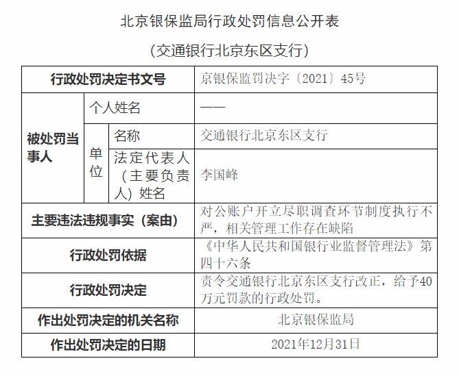 對(duì)公賬戶(hù)開(kāi)立盡職調(diào)查環(huán)節(jié)制度執(zhí)行不嚴(yán) 交通銀行北京東區(qū)支行被罰40萬(wàn)元
