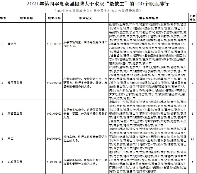 2021年第四季度全國招聘大于求職“最缺工”的100個職業(yè)排行前五位(人社部供圖)