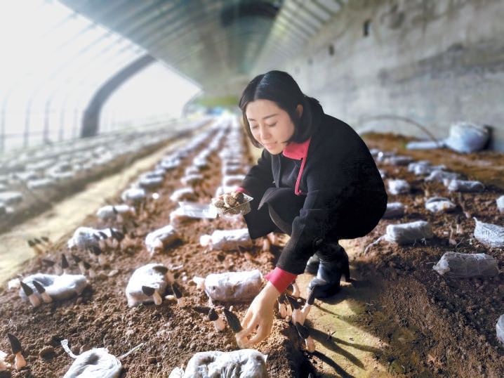 一頭利落的短發(fā),筆挺的身姿,明亮的笑容,39歲的董偉給人的第一印象有點(diǎn)颯。跟隨她來到位于懷柔區(qū)廟城鎮(zhèn)王史山村的溫室大棚,只見一個(gè)個(gè)小傘般的蘑菇頂蓋從土中鉆出來,看上去皺皺巴巴,筆直的菌柄呈象牙白色,村民們手持特制的小彎刀,嫻熟地將蘑菇從根部割下,不一會(huì)兒就裝滿了一筐?!斑@是羊肚菌,一種珍稀食用菌,聞起來有一股淡淡的香味?!闭f起蘑菇種植,董偉如數(shù)家珍,“羊肚菌是低溫菇,溫度一上來就不行了,收獲已經(jīng)接近尾聲。”